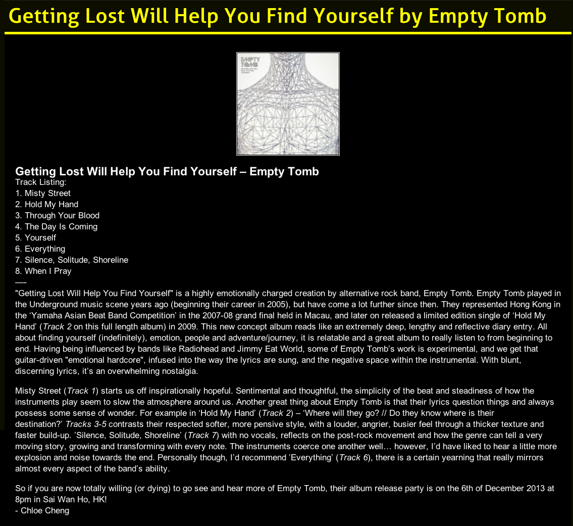 If you have never heard of Empty Tomb, it is not uncommon that from the look of their name, you think of them as a death metal band or something similar. But in fact the inspiration of their name comes from the resurrection of Jesus Christ, and they are five incredibly talented, versatile musicians who share the same goal, same ambition, if not the same religion. Having influenced by bands like, to name a few, Jimmy Eat World, The Get Up Kids, Whence He Came and Buddhiston, Empty Tomb’s music is reflective, melancholic and deeply sincere. Their hard work and persistence have also made them one of the most popular bands within the local indie music scene.